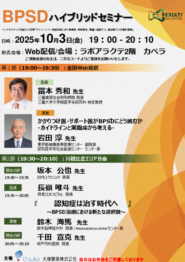 認知症BPSD:Behavioral and Psychological Symptoms of Dementia/認知症の行動・心理症状にどのようにアプローチしていくかをご紹介するとともに、川越市の先生方と「より良い認知症診療とは何か」について議論を深めてまいります!