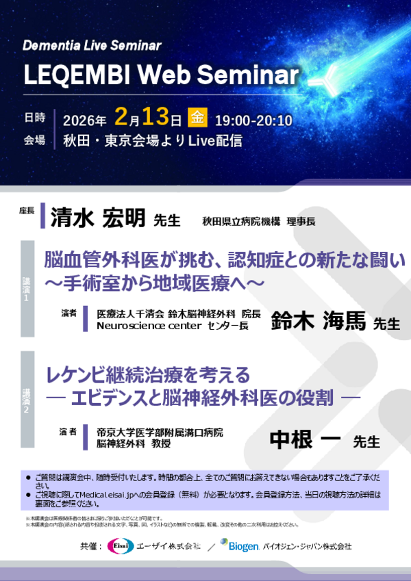 本講演では、この両氏とともに、認知症診療の現在とその先にある未来について、最新の知見と臨床経験を踏まえた討論を行います!