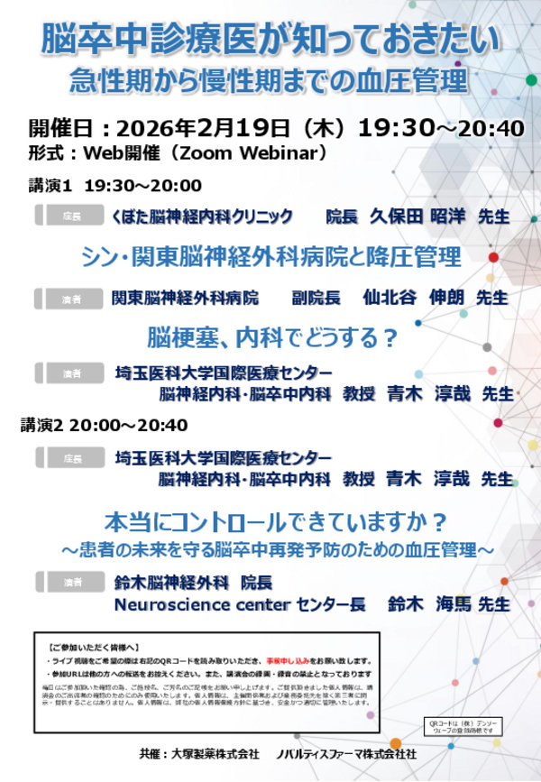 脳卒中診療において血圧管理は最も基本でありながら、急性期・回復期・慢性期それぞれで判断に迷う場面も少なくありません。本講演では、最新のガイドライン改訂を踏まえつつ、「本当に血圧はコントロールできているのか」「どの段階で介入すべきか」「再発予防につなげるために何を意識すべきか」といった、日常診療で直面する疑問を整理します!