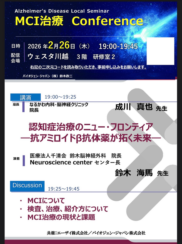 鈴木海馬院長が、川越市とその周辺地域における認知症診療のリアルを踏まえ、抗アミロイドβ抗体薬治療とMCI診療をめぐる「現場での判断」をテーマにお話しします!