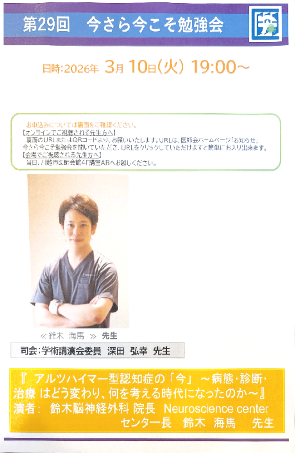 鈴木海馬院長が、アルツハイマー型認知症診療の「今」をテーマに、病態理解・診断・治療の最新の変化をわかりやすく解説します!